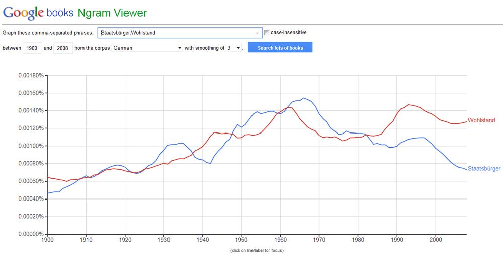 Auch das auf Google-Ngram sehr gut zu sehen. Der Bürger in der viel gepriesenen Mitte ist kein Staatsbürger, sondern ein Wohlstandsbürger. Und genau das ist gemeint, wenn heute von bürgerlich die Rede ist. Der Besitzstandswahrer ist zum Kern der Politik geworden, der besitzende, hortende, sich übers Haben definierende Mensch.