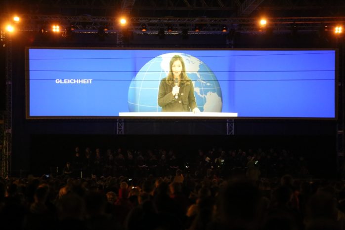 Er baut jedes Mal das entsprechende Programm, das die Schaulustigen auf dem Augustusplatz zu sehen bekommen. Stets mit Künstlern möglichst aus Leipzig oder – wie in den vergangenen Jahren – aus den eingeladenen Ländern. Diesmal war es der Chor der Oper Leipzig, der im Mittelpunkt und auf der Bühne stand. Über ihm eine große Bildwand, auf der immer wieder die TV-Journalistin Pinar Atalay eingeblendet wurde, die auf einer Nebenbühne ihr eigenes kleines Nachrichtenstudio hatte. Sie steht für all jene jungen Deutschen mit Migrationshintergrund, die längst zum offiziellen Bild der Republik gehören. Seit sie in der ARD die “tagesthemen” moderiert, ist sie deutschlandweit bekannt.
