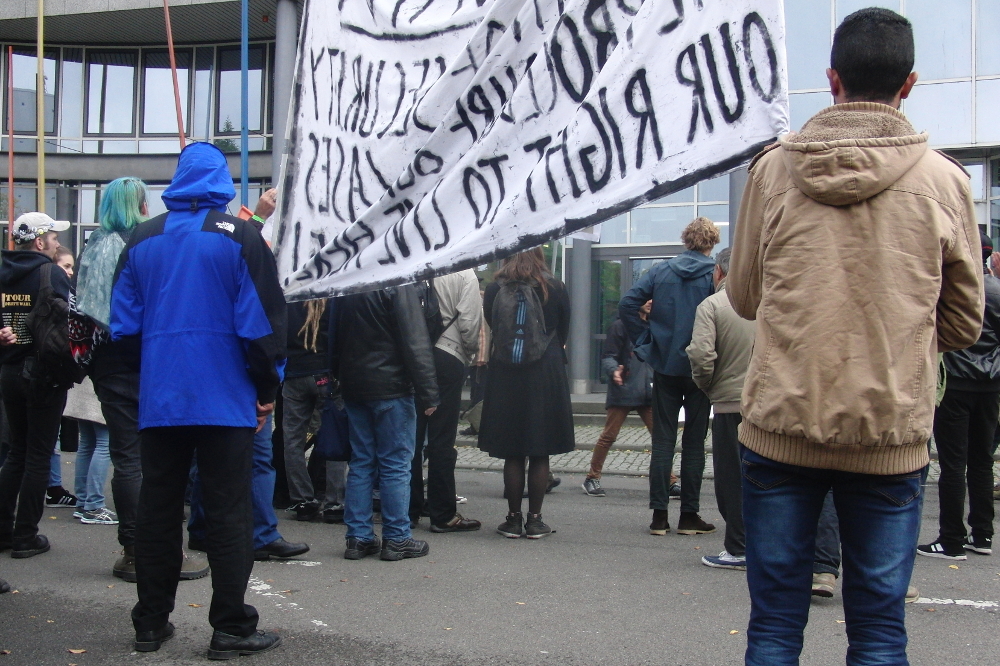 Auch auf Bannern und in vorgefertigten sowie spontanen Redebeiträgen kam zum Ausdruck, dass es den Geflüchteten nicht um Wohlstand, sondern um Bildung, Arbeit, Sicherheit und vor allem eine „Bleibeperspektive“ – um einmal das aktuelle Lieblingsunwort vieler Politiker aufzugreifen – sowie eine zügige Bearbeitung ihrer Fälle geht. „Wir sind nicht nur Geflüchtete, sondern vor allem Menschen, die ein Leben in Würde fordern“, hieß es dazu im zentralen Aufruf, der mit den Worten schließt: „Heute zeigen wir unsere Solidarität mit allen Nicht-Bürgern in Deutschland und Europa – gegen Dublin und reaktionäre Asylpolitik.“