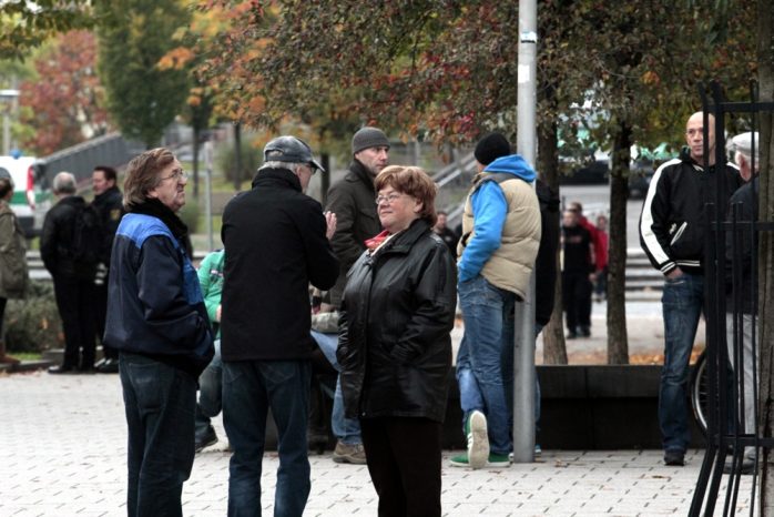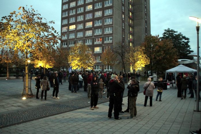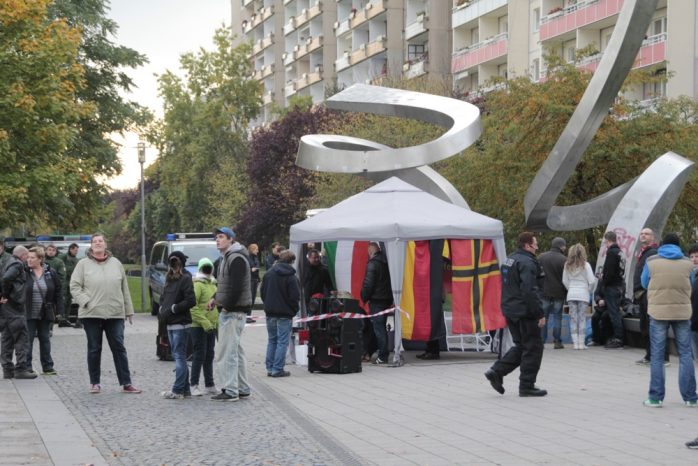 Da gern bei den Zahlen herumgerätselt wird, hier ein kleiner Blick über den Kundgebungsplatz der OfD am 17. Oktober. Nach den bis zu 350 Beteiligten noch am 26. September 2015 kann diese zweite Auflage der “Offensive für Deutschland” getrost als Schlag ins Wasser gelten. Kaum 100 Teilnehmer fanden den Weg in den Stadtteil Grünau – offenbar entgegen des Kalküls der Macher um Silvio Rösler, welche hier einen sozialen Brennpunkt in Leipzig und eine hohe Solidarisierung mit den ausländerfeindlichen Parolen erwartet haben könnten. Stattdessen gab es vereinzelten Protest der Anwohner mit Rasseln und Rufen am Kundgebungsplatz. Mehr dazu im Liveticker auf L-IZ.de.
