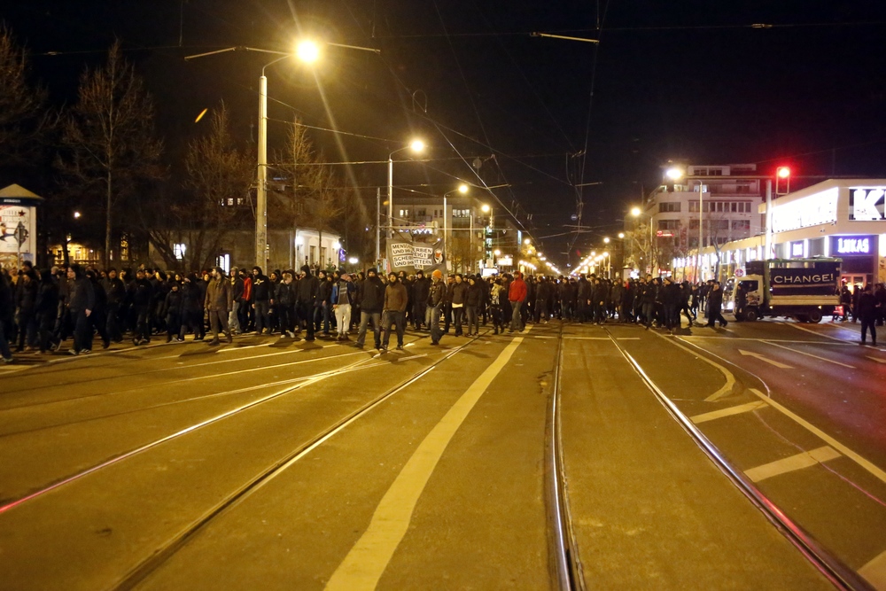 Wir balancieren die Schienen entlang in Richtung Kreuzung Karli, Kurt-Eisner-Straße. Die Kreuzung steht voll mit schwarz gekleideten Menschen. Was ist da los? Ich dachte die Demos und die Straßenschlachten sind durch, die Straße ist doch schon verwüstet.