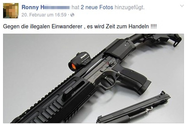 Nicht weit scheint diese Frage angesichts eines Users, welcher seit Tagen geradezu hysterisch rechtsextreme Facebookposts im Minutentakt abgibt. Ronny H. rief gar dazu auf „zur Waffe zu greifen“. Er möchte „diese Araber köpfen“, der Antifa hat er den Krieg erklärt. Wie ernst diese Wortmeldungen zu nehmen sind, zeigt ein Blick auf sein Facebookprofil, in dem er Fotos von Schusswaffen postet und Ziele benennt: Einwanderer, Antifaschisten sowie eine namentlich erwähnte Privatperson. „Die werde ich als Erstes köpfen. Ich freue mich schon drauf.“ Zudem hätte H. laut Facebookbeitrag „Bomben und Chemikalien“ in seinem Besitz. Das sei schließlich nicht schwer herzustellen, behauptet der fanatische Waffennarr.