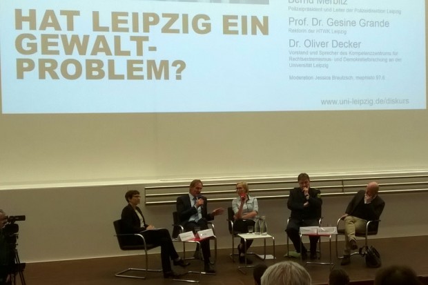 Ist Leipzig nun eine besondere Stadt? Hat die größte Stadt Ostdeutschlands – „Lassen wir mal Berlin außen vor.“ (OBM Jung) - auch ein besonderes Problem mit politisch motivierter Gewalt? Das ist keine Frage. Darüber waren sich die Teilnehmer des 6. Donnerstag-Diskurses am 14. April in zwei Stunden relativ schnell einig. Moderiert von Jessica Brautzsch (mephisto 97,6) arbeitete man sich durch die hinaufwindende Gewaltspirale in der Stadt, betrachtete nochmals die Ereignisse vom 12. Dezember 2015 und 11. Januar. Vor knapp 100 Zuschauern im großen Hörsaal. Allen voran Oberbürgermeister Burkhard Jung, der vor dem Hintergrund zunehmender Fremdenfeindlichkeit an politischer Kontur zu gewinnen scheint.