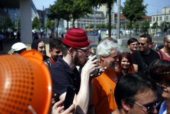 Knapp 100 Personen versammelten sich am Sonntagmittag im Grimmaischen Steinweg, während sich mehrere tausende Christen zum Hauptgottesdienst auf dem Augustusplatz versammelt hatten. Ursprünglich war für halb Zwölf eine Nudelmesse geplant – eine Zeremonie der Kirche des fliegenden Spaghettimonsters (FSM).