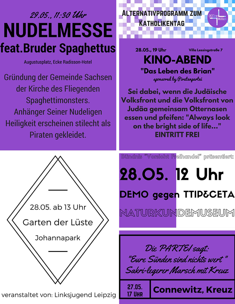 Sonntag 29. Mai, 11:30 Uhr Augustusplatz (Ecke Radisson-Hotel): Nudelmesse feat Bruder Spaghettus. „Wir feiern mit euch und Bruder Spaghettus (bekannt aus Funk und Fernsehen) eine Nudelmesse und gründen damit die Gemeinde Sachsen der Kirche des Fliegenden Spaghettimonsters. Anhänger Seiner Nudeligen Heiligkeit erscheinen stilecht als Piraten gekleidet.“