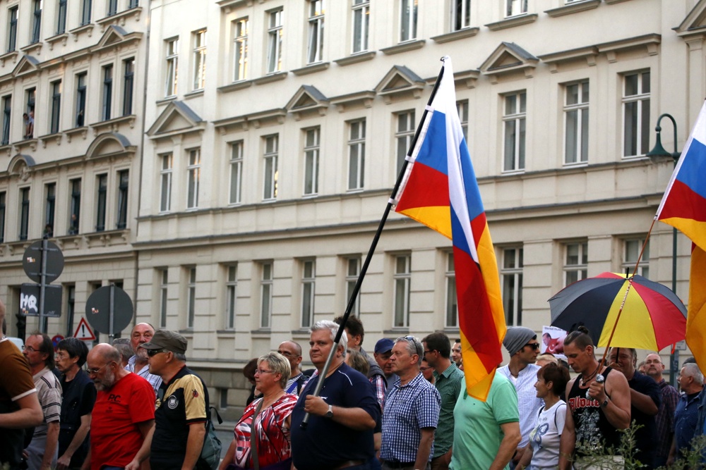Interessiert es noch jemanden, was da auf dem Richard-Wagner-Platz und heute mal am Naturkundemuseum stattfindet? Gut - die dauernden Sperrungen immer ... Ok, und die, die in geringer Zahl zum Platz selbst seitens Legida und heute auch Pegida pilgern sicher. Die ersten Eindrücke vor Ort zeigen ein – vergleicht man es mal mit den ersten Tagen der „Bewegung“ - Häufchen mit Deutschlandfahnen. Noch geht es nicht um Fußball, sieht aber schon fast an diesem sommerlichen Abend in Leipzig so aus. Also machen wir doch erst einmal ein paar hübsche Bilder …