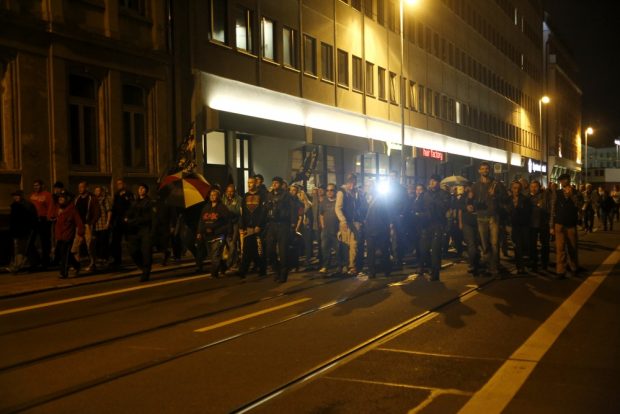 Kurz nach 19 Uhr hat die Fahrraddemo den Wagnerplatz passiert. Auch diese richtet sich heute gegen Legida und möchte mit der gemeinsamen Ausfahrt gegen rechte Strukturen rings um den Verein demonstrieren.