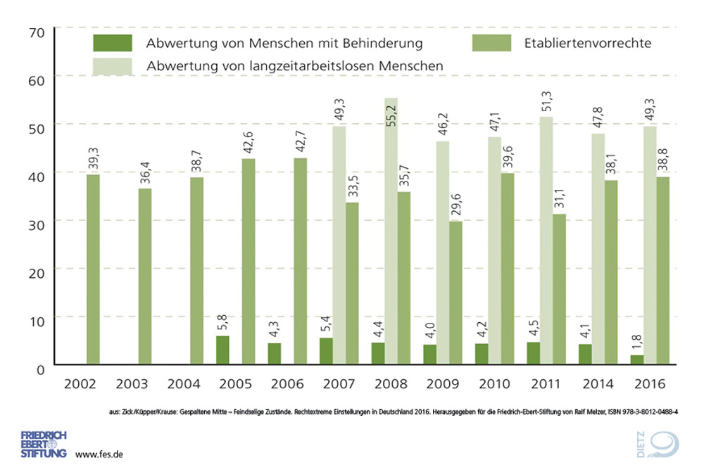 Seit 2002 untersucht das Institut für Interdisziplinäre Konflikt- und Gewaltforschung (IKG) der Universität Bielefeld die Facetten Gruppenbezogener Menschenfeindlichkeit (GMF) in Deutschland. Daraus entstehen dann regelmäßig die sogenannten „Mitte“-Studien für die Friedrich-Ebert-Stiftung (FES). Am Montag, 21. November, hat man die neuesten Befragungsergebnisse veröffentlich. Mit einer überraschend fehlenden Überraschung.