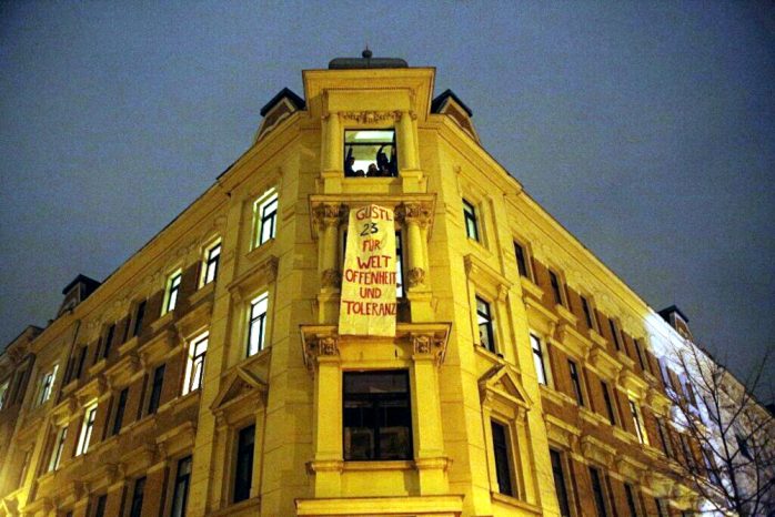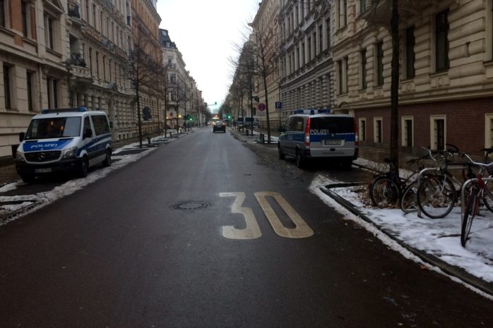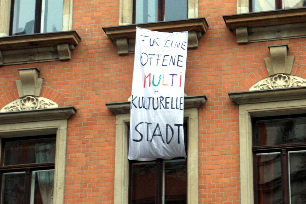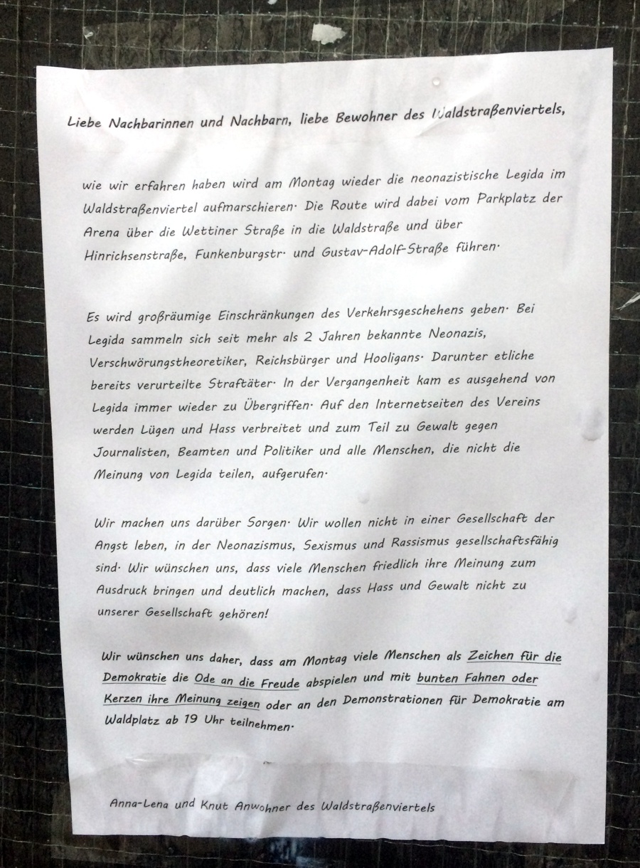 Ähnlich sehen offenkundig die Anwohner des seit 16 Uhr bereits weitgehend beräumten Waldstraßenviertels den heutigen Marsch durch ihre Ecke Leipzigs. An vielen Türen hängt eine Information von Anwohnern, die ersten Banner sind bereits an den Fenstern erschienen. Zu erwarten steht, dass es auch heute wieder aus so manchem verdunkelten Wohnzimmer „Freude schöner Götterfunken“ erschallen dürfte.