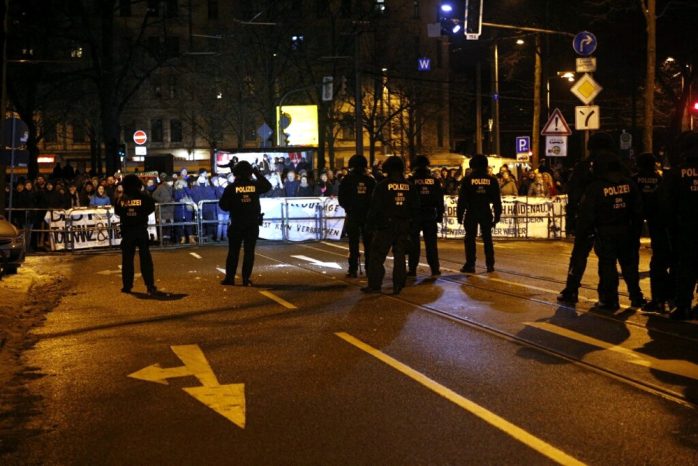 Kurz bevor die Demonstration von “A monday without you” unter Rufen wie “alerta, alerta, Antifaschista” und “Es gibt kein Recht auf Nazipropaganda” den Innenstadtring erreicht hat, gibt es hier den ersten Böllerwurf. Bekannt ist, dass sich am heutigen Tag wohl auch Teile von linksorientierten Fußballvereinen unter den Gegendemonstranten befinden dürften.Insgesamt verlaufen jedoch derzeit alle Demonstrationen friedlich.
