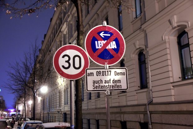 Bereits am Abend zum 9. Januar hatten Aktivisten mehrere Stoppschilder im Viertel zu welchen für, demnach gegen, Legida umfunktioniert. Während sich auch die Bürgervereine im Waldstraßenviertel und in Gohlis bereits vor dem heutigen Tag gegen Legida positionierten, rufen unter anderem bekannte Leipziger Bündnisse wie „Leipzig nimmt Platz“ zu Gegenprotest auf. Der Twitterhastag #blockruf hat mittlerweile den üblichen #le0901 beinahe überholt in der Gunst der aktiven Twitterbeiträge.