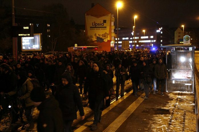 Die Initiative “Durchgezählt” meldet unterdessen von der Demo “a monday without you”: diese “erreicht mit 700-750 Menschen die Innenstadt von Leipzig”. Der Landtagsabgeordnete Marco Böhme (Linke) berichtet unterdessen, Legida-Anhänger seien in Polizeibegleitung in größeren Gruppen auf dem Weg von der Arena zur Auftaktkundgebung auf dem Stadionvorplatz.
