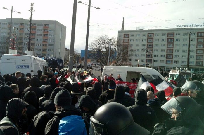 Am 12. Dezember 2015 war es am Südplatz, weitab und nach der Neonazidemo hier zu massiven Steinwürfen auf Polizeibeamte gekommen. Die Rechten stehen sich unterdessen auf der Semmelweisstraße die Beine in den Bauch, während die Gegendemonstration an der Nationalbibliothek / Deutscher Platz direkt an der Strecke angewachsen ist und bis zur Straße vorzurücken versucht.
