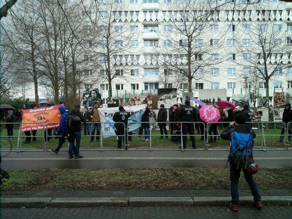 Neben der Nationalbibliothek haben sich auch 300 bis 400 Gegendemonstranten bereits am Bayrischen Platz, dem Endpunkt der Nazidemonstration, eingefunden. Bis auf einige kleinere Rangeleien zwischen einigen Autonomen und der Polizei ist der Tag bislang ziemlich reibungslos und friedlich verlaufen.