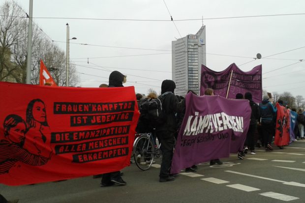 Der Feminismus steht vor schweren Zeiten, wenn Demonstrationen allein damit gefüllt werden könnten, alle sexistischen Twitter-Einträge und sonstigen diesbezüglichen Äußerungen des amtierenden US-Präsidenten vorzulesen. Das Bündnis „Feministische Kämpfe in die Offensive“ hat am Samstagnachmittag einen anderen Weg gewählt und in eher theoretisch angelegten Redebeiträgen unter anderem die Neue Rechte, den Kommunismus und die Arbeitsbedingungen in Pflegeberufen thematisiert. Etwa 1.000 Menschen sind dem Aufruf zur Demonstration gefolgt.