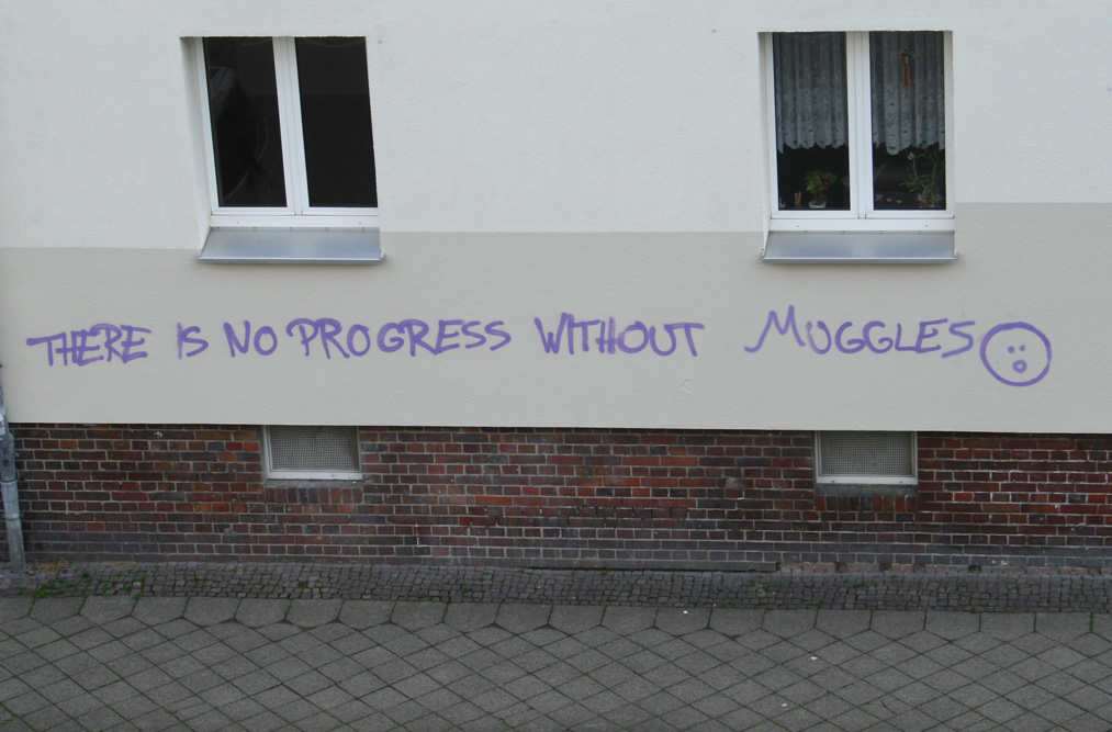 Ich weiß auch nicht, welchen Fortschritt Sie speziell mit Ihrem Spruch „There is no progress without struggle!“ meinen. Unsere Großkopferten meinen ja meist nur den technischen Fortschritt, die Erfindung immer neuer technischer Spielereien, die die Muggles vom Denken und Arbeiten befreien. Den menschlichen Fortschritt vergessen sie meist.