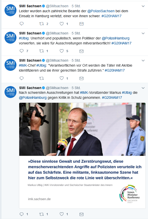 Der Twitteracount des Innenministeriums Sachsen - ohne Tweet zur Demoauflösung, aber zu den Krawallen. Es war alles richtig. Screen twitter SMI Sachsen