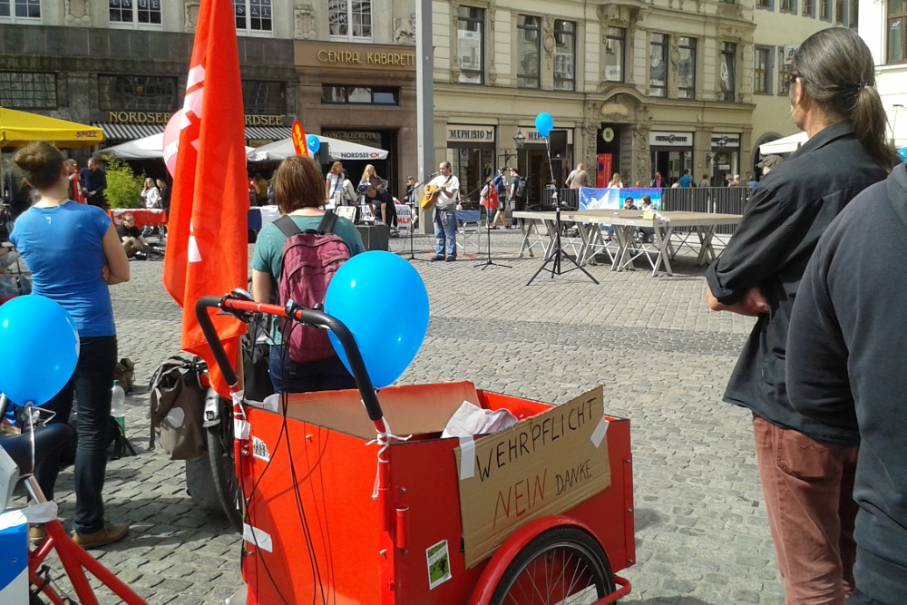 Auf dem Marktplatz waren ab 11 Uhr mehrere Organisationen mit Infoständen anwesend, darunter die Linkspartei, die MLPD und die Bürgerinitiative „Gute Nachbarschaft mit Russland“. Mit Franziska Riekewald, Adam Bednarsky, Margitta Hollick und Sören Pellmann waren mehrere Stadträte der Linksfraktion vor Ort.