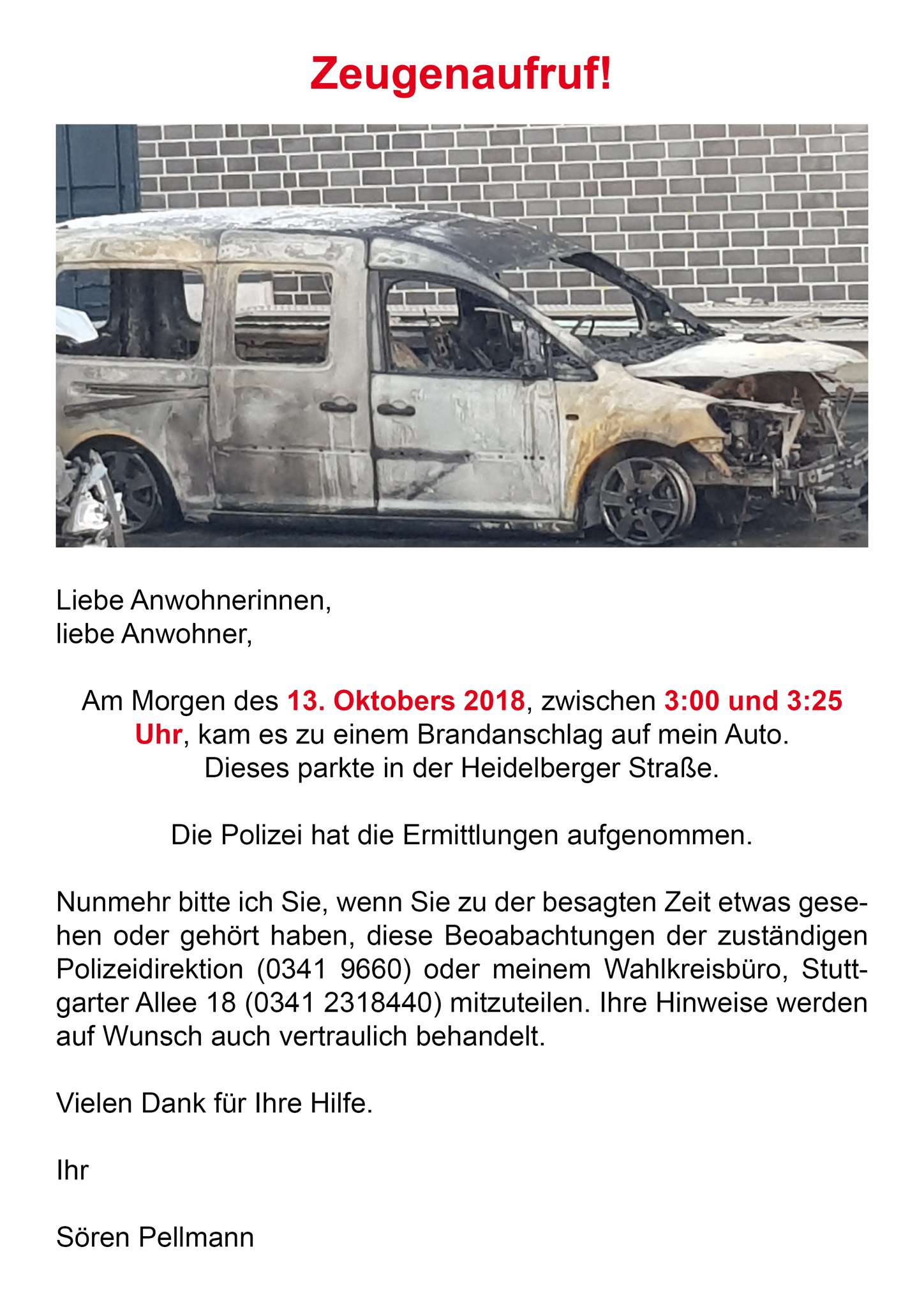 Ein Foto und der Name des Politikers sowie Materialien für die „Unteilbar“-Großdemonstration in Berlin sollen sich an beziehungsweise in dem Auto befunden haben. „Da das Auto klar zuzuordnen ist, gehe ich von einem politischen Anschlag gegen meine Person aus“, sagte Pellmann. Auf Facebook schrieb Pellmann zudem, regelmäßig bedrohliche E-Mails und Anrufe erhalten zu haben. Zudem seien immer wieder Personen im Wahlkreisbüro in Grünau aufgetaucht und hätten Mitarbeiter beschimpft.