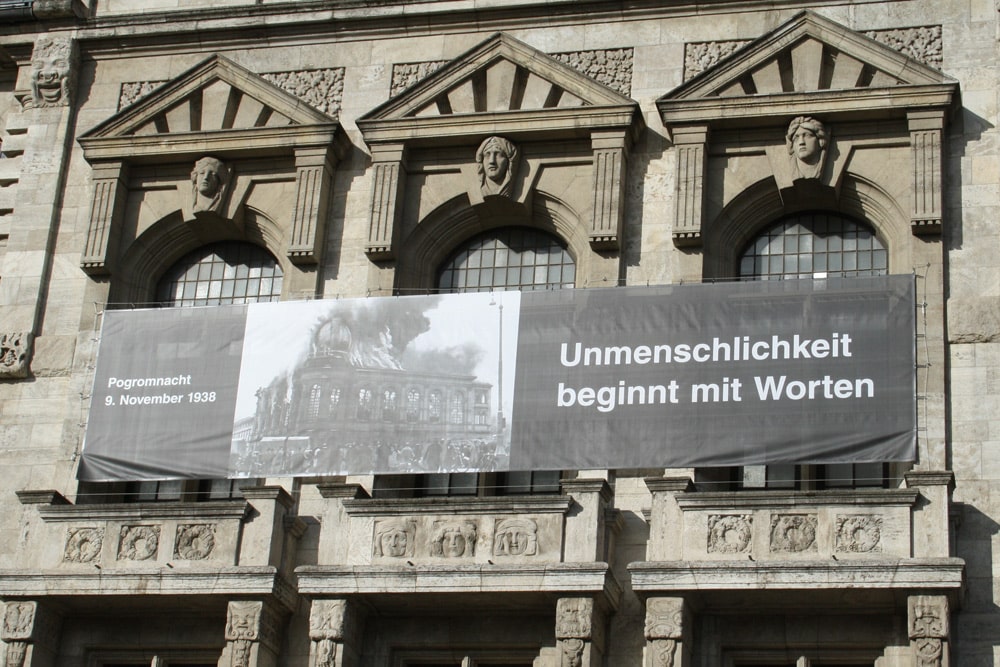 „Unmenschlichkeit beginnt mit Worten“, kann man jetzt auf dem Plakat mit der brennenden Synagoge lesen.