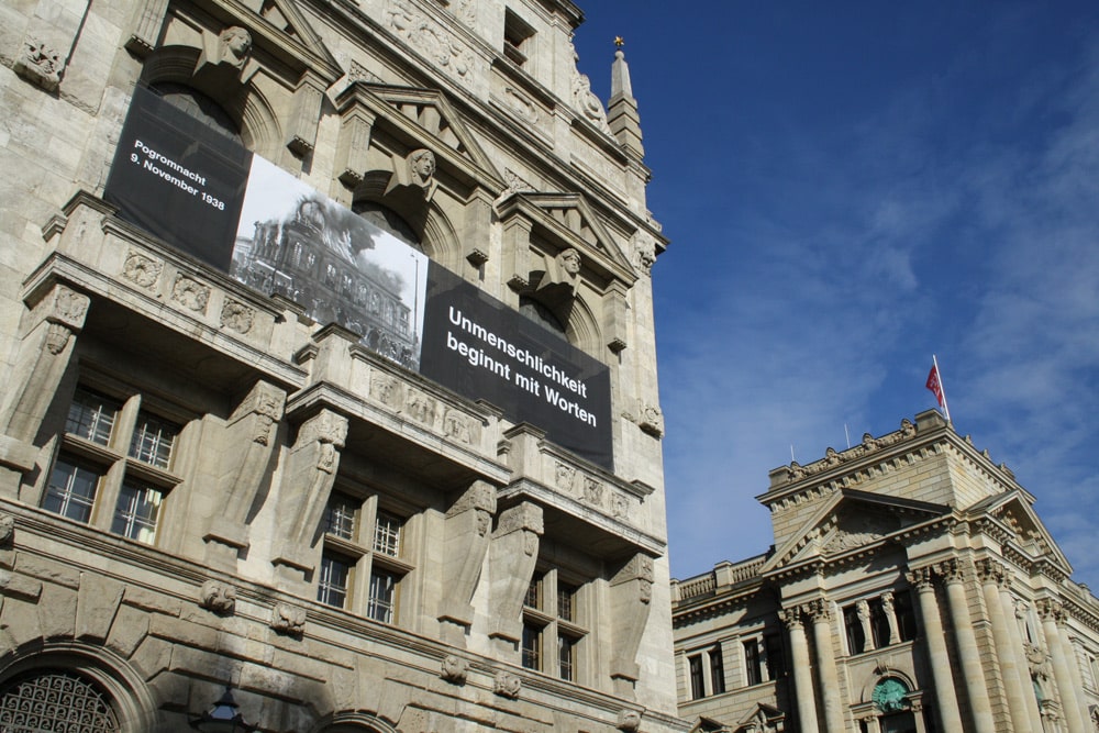 Am Freitag, 2. November, wurde am Neuen Rathaus ein Großplakat enthüllt, das nicht nur an diesen Tag erinnert, sondern auch daran, dass der 9. November 1938 nicht aus dem Nichts kam. Er hatte einen langen Vorlauf. Und der ist aufs Engste verknüpft mit der Verschärfung der politischen Auseinandersetzungen in den 1920er Jahren und der Radikalisierung der gesellschaftlichen Ränder.