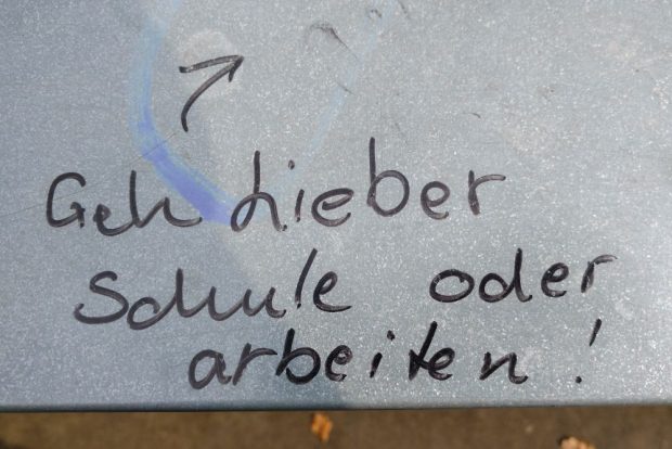 Meist gucken wir, wo es was zu holen gibt, hängen hier und da ab oder schieben Langeweile, die aber schnell zu Action werden kann. Wie letztens im Mc Geiz, als wir den Eingang mit Böllern bewarfen, woraufhin wir eine Anzeige wegen Hausfriedensbruch bekamen. Bis auf die Anzeige und den Nackenschellen von meinen Eltern hat sich‘s aber gelohnt, da wir gleichzeitig ein paar Dinge aus dem Laden trugen, für die unser Taschengeld niemals ausreichen würde.