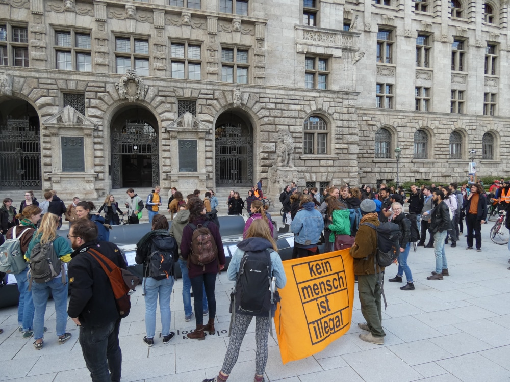 Nach Angaben des Veranstalters waren Flüchtende in diesem Boot auf dem Mittelmeer unterwegs. Die libysche Küstenwache habe die Personen jedoch zurück nach Afrika gebracht. „Ob sie mit anderen Booten die Flucht geschafft haben, noch in Libyen oder tot sind, werden wir nie erfahren“, heißt es im Demoaufruf der „Seebrücke“.