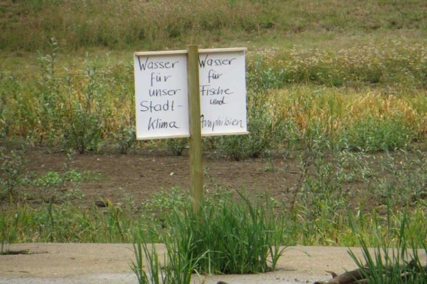 Nachtrag, 8. August: Und da es um Details und Aufmerksamkeit geht: Hier noch ein Foto von Claus Reinhardt, der die Wasserlosigkeit des Rosentalteiches schon mit einer Anfrage ans Amt für Stadtgrün und Gewässer thematisiert hat, und der uns hier die Rückseite des Schildes zeigt, das im nun seit Wochen wasserlosen Rosentalteich steht.