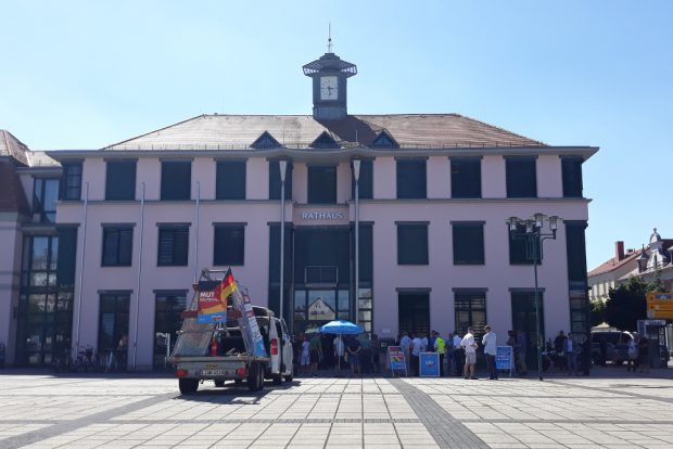 Kaum sind die Aktivistinnen auf dem Marktplatz in Naunhof angekommen, werden sie aus einem Auto heraus mit „Hey, hey, Zecki“-Rufen empfangen. Unter den Anwesenden sorgt das eher für Belustigung. Generell ist die Stimmung entspannt, auch in den Gesprächen zwischen Müller, Polizei und Versammlungsbehörde. Die Antifa-Gruppe stellt sich unter einen der Schatten spendenden Bäume auf dem Markt.