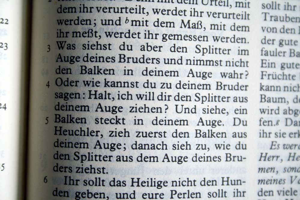In meiner Luther-Bibel klingt die zweite Variation des Spruches übrigens noch schöner, lutherischer: „Du Heuchler, zieh zuerst den Balken aus deinem Auge; danach sieh zu, wie du den Splitter aus dem Auge deines Bruders ziehst.“