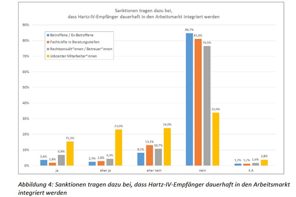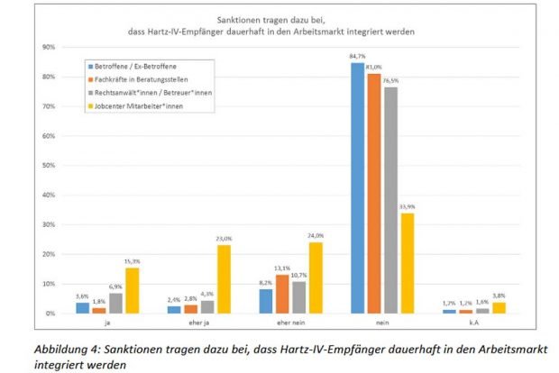 86,9 % aller Befragten hielten Sanktionen „nicht für geeignet“, um eine dauerhafte Integration in den Arbeitsmarkt zu gewährleisten. Vielmehr führen die Sanktionen nach Meinung von 80 % der Umfrageteilnehmer/-innen zu schlechter entlohnten und prekären Jobs.