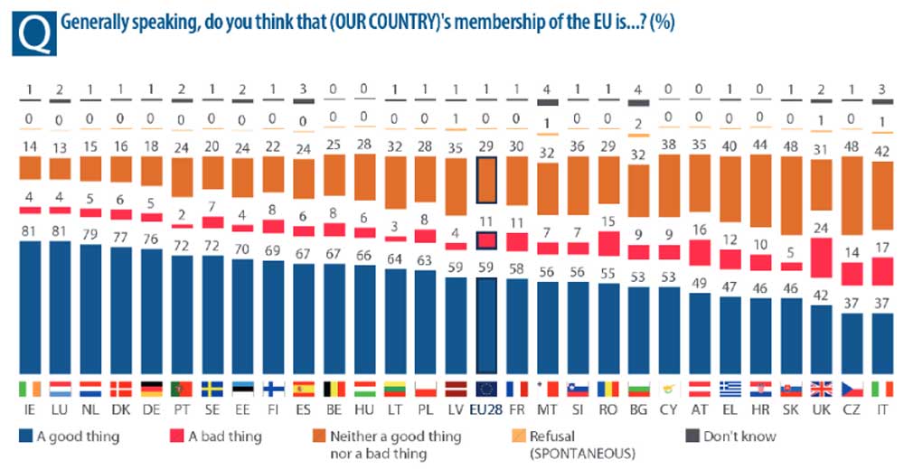 Fast sechs von zehn EU-Bürger/-innen (59 %) befürworten die EU-Mitgliedschaft ihres Landes. Damit bleibt die Unterstützung der Bürger/-innen für die Europäische Union auch im dritten Jahr in Folge hoch. In Deutschland sind 76 % der Meinung, dass die Mitgliedschaft in der EU eine gute Sache sei.