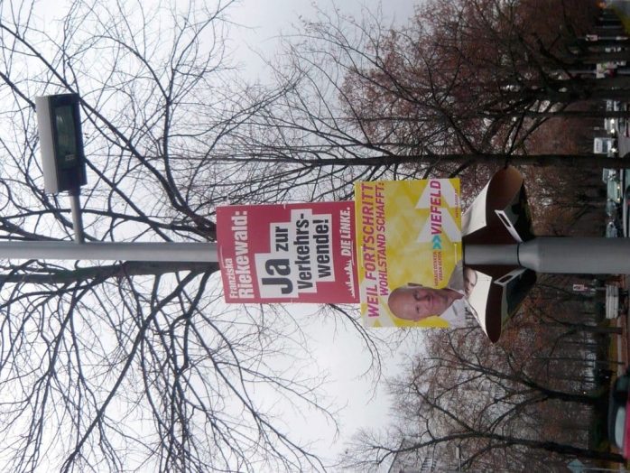 Auf die Idee einer wahlplakatbasierten Ausschau auf die OBM-Wahl brachte mich allerdings Franziska Riekewald von der Linken. Genauer gesagt ihr Fotograf oder ihre Fotografin. Was für eine Zumutung ist das denn bitteschön? Unscharf, schlecht ausgeleuchtet, mit einem unansehnlichen Rotstich.