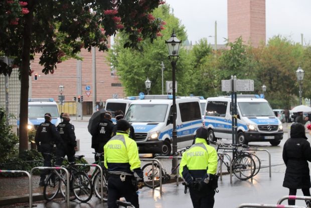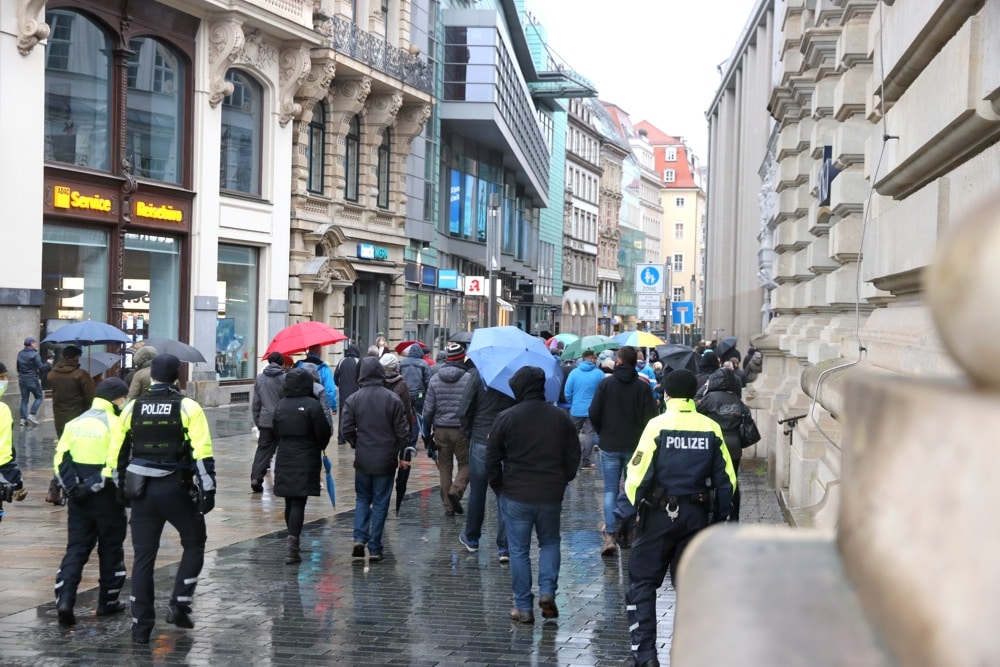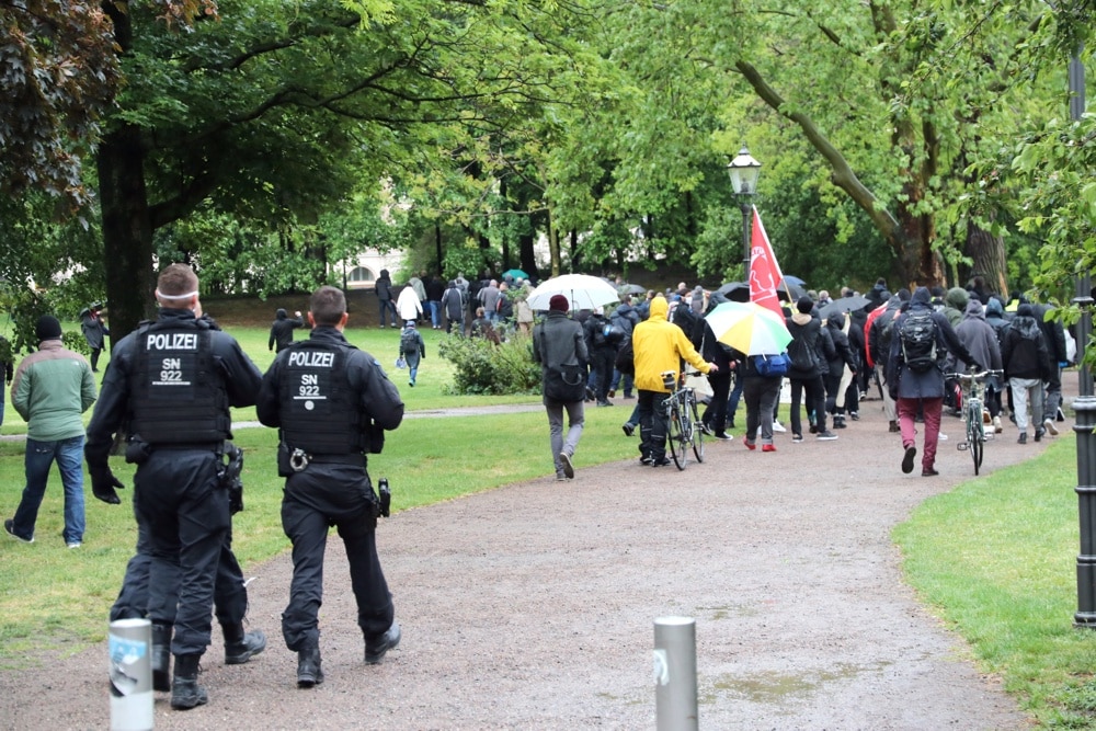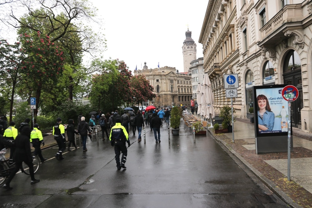 Etwa 25 Personen, die zuvor bei der Kundgebung von „Leipzig nimmt Platz“ waren, folgten der Gruppe auf ihrem Weg vom Augustusplatz an der Moritzbastei entlang ins Zentrum. Die Polizei war diesmal mit mehreren dutzend Beamten vor Ort. Etwa auf der Hälfte der Strecke löste sich die „Gegendemo“ auf. Das lag wohl auch daran, dass die Polizei ohne vorher erkennbaren Anlass filmte und eine angebliche Beamtenbeleidigung registrierte. Aufzüge sind laut aktuell gültiger Rechtsverordnung in Sachsen eigentlich verboten.