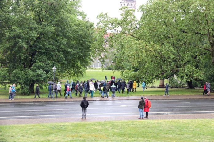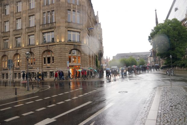 Wie schon am vergangenen Montag versammelten sich auch heute wieder etwa 150 Personen zu einem „Spaziergang“ durch die Innenstadt. Zu diesem war zuvor in Gruppen des Nachrichtendienstes „Telegram“ aufgerufen worden. Die Teilnehmenden verzichteten auf Banner und Parolen, um nicht als Demonstration gewertet zu werden – aber auch auf Mundschutz und Abstand.