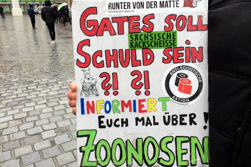 Eine andere Person hatte einen Zettel bei sich, auf dem zu lesen war, dass Ausländer angeblich besser behandelt würden als Deutsche und es Zeit sei, „sich gegen das Regime zu wehren und zu kämpfen“. Auf Nachfrage erklärten mehrere Personen (siehe Video) das Coronavirus als ungefährlich oder forderten anwesende Journalisten auf „mal zu recherchieren“.
