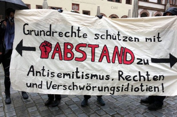 Die Redner/-innen betonten, dass es legitime Kritik an den Corona-Regeln und dem Handeln der Regierungen gebe und sie selbst gegen zu starke Auflagen klagen würden. Doch für Antisemitismus, Verschwörungsideologien und gemeinsamen Protest mit Rechtsradikalen dürfe es keinen Raum geben. In einem Redebeitrag (siehe Video) erläuterte ein Sprecher zudem personelle Zusammenhänge zwischen den 2014 stattgefundenen „Montagsmahnwachen“ und den heutigen Demonstrationen aus Sicht des Bündnisses.