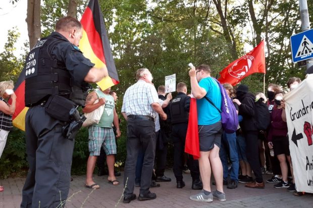 Etwa hundert Personen verschiedener antifaschistischer Bündnisse aus Leipzig versammelten sich am Montagabend in Leipzig-Engelsdorf, um dem „Corona-Spaziergang“ von etwa 25 Engelsdorfer/-innen entgegenzutreten. Der Großteil der Gegenprotestierenden, etwa 75 Menschen, war einem Aufruf des Aktionsnetzwerks „Leipzig nimmt Platz“ gefolgt und mit dem Zug vom Leipziger Hauptbahnhof angereist. Ausgangspunkt beider Versammlungen war das Gymnasium Engelsdorf.