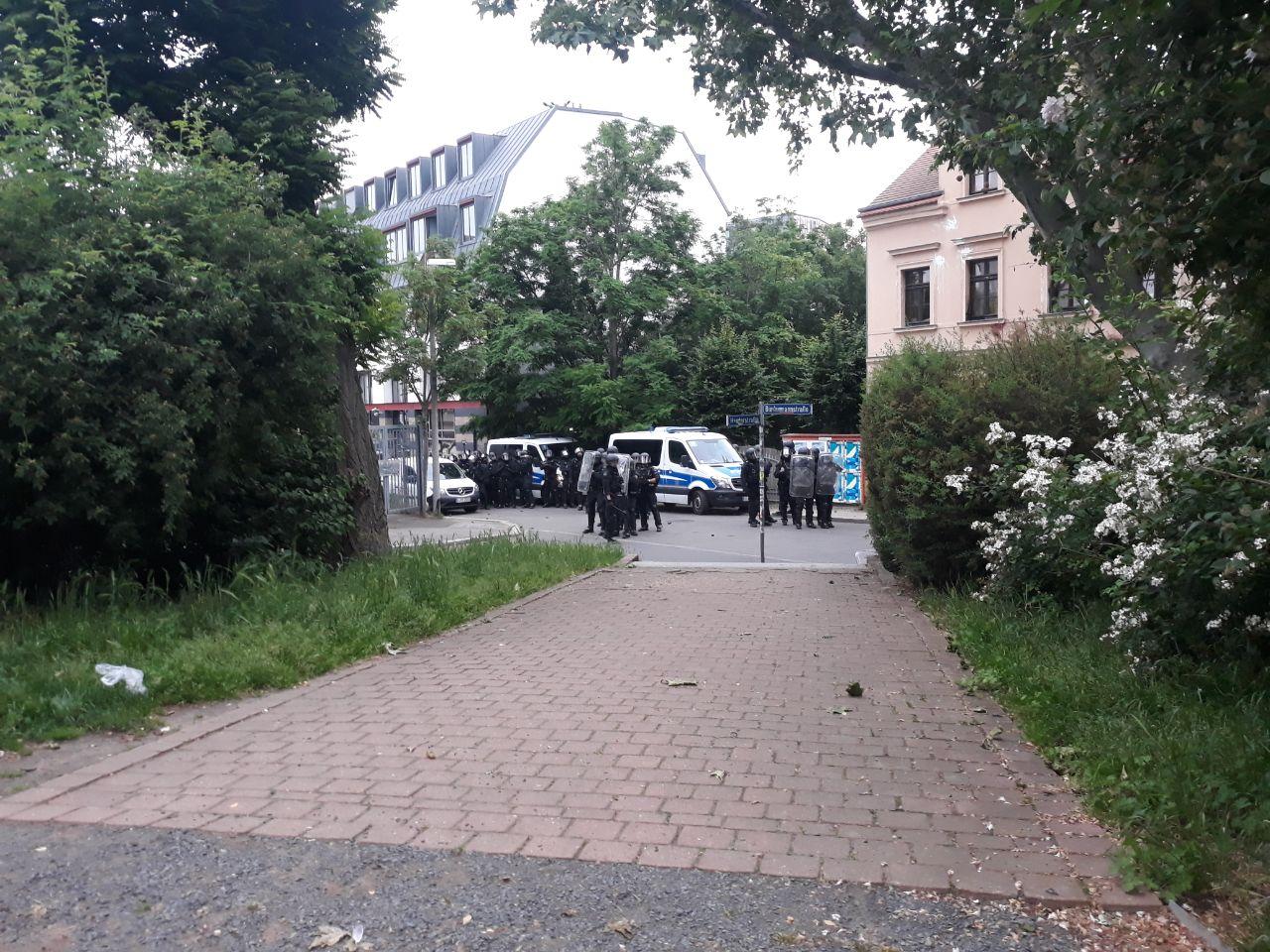 Erst sah es nur nach einer Personalienfeststellung bei vier Personen auf der Meusdorfer Straße aus, nun sind es vermutlich drei Ingewahrsamnahmen geworden. Die Polizei hat mit ihnen sehr wahrscheinlich Richtung Polizeipräsidium an der Dimitroffstraße den Ort bereits verlassen. Genaueres dürfte erst die Polizeimeldung erbringen, die noch am Abend zum heutigen Einsatz erwartet wird. Insgesamt gesehen, verläuft der Abend jedoch bislang weitgehend ruhig. Oder eben ruhiger als erwartet – je nach Erwartungshaltung.