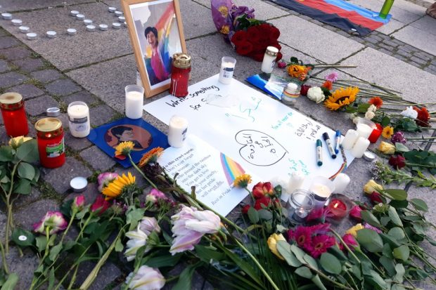 Die Treppen zum Brunnen dienten als Redepult, über ihnen war ebenfalls eine Regebogenflagge ausgebreitet, deren bunte Farben die Stufen hinunterzufließen schienen. Zwischen den Redebeiträgen zündeten Menschen Kerzen und Räucherstäbchen in der Mitte des Versammlungsorts an und legten Blumen vor einem Porträt Sarah Hegazis nieder.