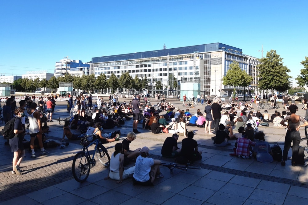Ihm lauschten über hundert Menschen, die sich halbkreisförmig um den Mendebrunnen gesetzt hatten. Sie trugen Mund-Nasen-Schutz, einige von ihnen eine Regenbogenflagge über den Schultern.