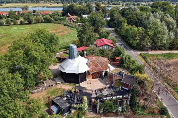 Dann sind wir auf die Wiese gegangen und haben einfache Holzbühnen gebaut. Eines Tages saßen vor uns 700 Leute. Und wir haben gedacht: okay, dann bauen wir uns jetzt einen adäquaten Theaterraum. Morgenstern hat sich als Architekt entpuppt und offenbar haben wir da etwas hingesetzt, was es so nicht gibt. Das gibts nur in Zollbrücke im Oderbruch.