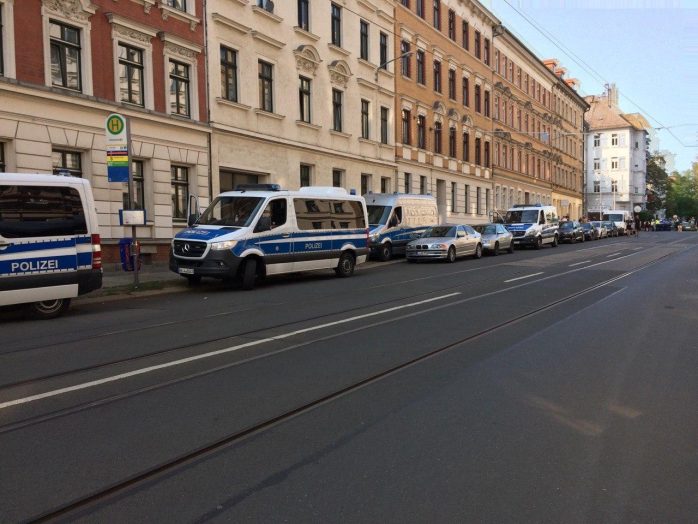 Die Demonstration ist noch nicht gestartet, es gibt noch keine Redebeiträge. Aber das Bild ist etwas skurril am hinteren Ende der Eisenbahnstraße. Etwa 250 Teilnehmende haben sich bislang eingefunden und es ist so viel Polizei vor Ort, dass wohl jeder mindestens zwei Beamte zur friedlichen Kommunikation vorfindet. Genau diese hat die Polizeidirektion für heute angekündigt.
