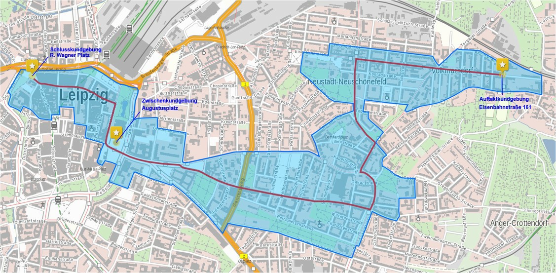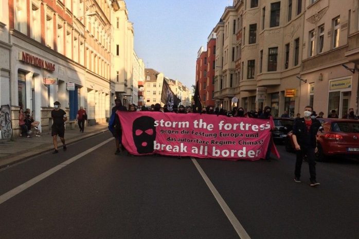 Aufzug „Storm The Fortress, Break All Borders: Gegen die Festung Europa und das autoritäre Regime Chinas“. Eisenbahnstraße 161 (Auftaktkundgebung), Hermann-Liebmann-Straße, Wurzner Straße, Breite Straße, Täubchenweg, Johannisplatz, Grimmaischer Steinweg, Augustusplatz (Zwischenkundgebung), Goethestraße, Brühl, Richard-Wagner-Platz.