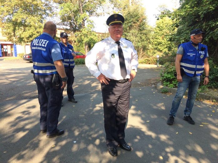 Um Kommunikation bemüht sind die Beamten heute in der Tat. Pressesprecherin Mandy Heimann erläutert noch einmal kurz vor dem Start der Demonstration die Aufgabe der Polizei am heutigen Tage.
