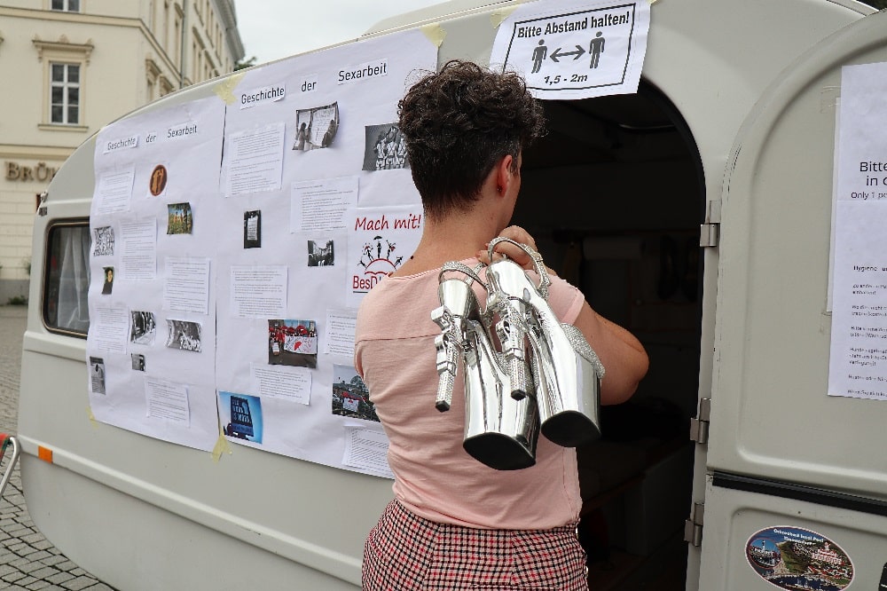 Plakate an der Außenverkleidung des Wohnwagens informierten über die Geschichte der Sexarbeit. Im Innenraum repräsentierten Peitschen, Dildos und Massagebürsten, wie facettenreich das Gewerbe sein kann. Sexarbeiterinnen und Mitarbeiterinnen der Aidshilfe standen für Gespräche bereit, vor ihnen mit Regenbogenflaggen überzogene Tische, auf denen Flyer und Sticker auslagen.