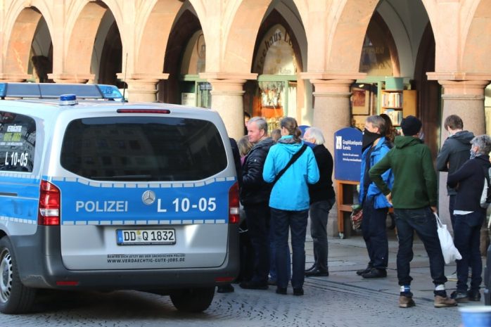 Der Staat schlief dieses Mal nicht und war bereits vor ihrem Eintreffen mit gleich mehreren Einsatzwagen vor Ort. Statt alle zu überraschen und zu wecken, musste die Aktion als Versammlung vor Ort angemeldet werden, bevor sie sich im Durchgang des Alten Rathauses umkleiden durften. Mindestens zwei beteiligte Personen aus dem Umfeld der sogenannten „Montagsspaziergänge“ waren an der Aktion beteiligt und trugen den Maskenträgern unter dem Protest etwa 25 Gegendemonstranten die Rucksäcke hinterher.