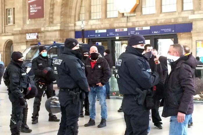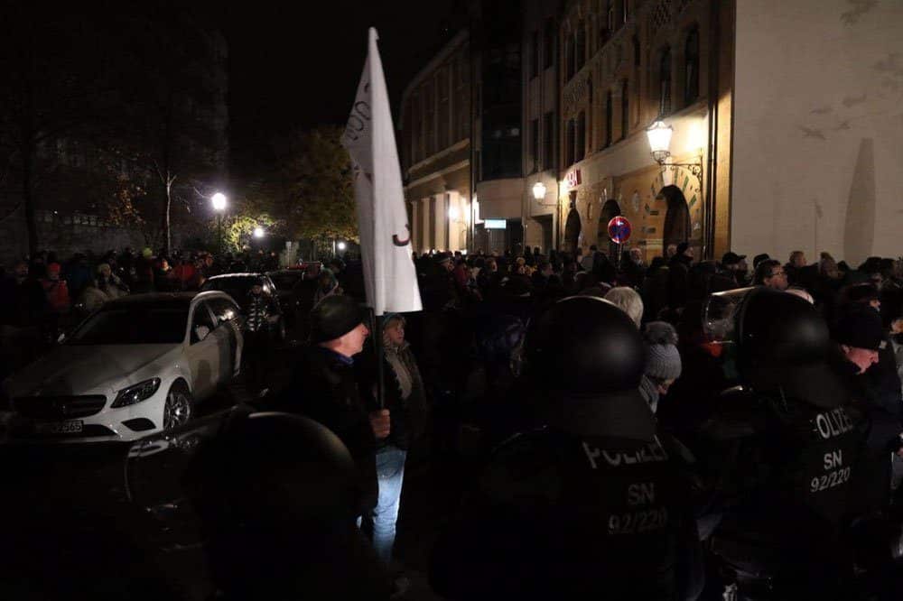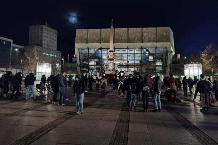 Die Klientel bei den Pandemie-Leugner/-innen ist eine Mischung aus älteren Personen und eher jungen, kräftigen Neonazi-Gruppen. Vielen scheint nicht klar, wo genau heute etwas stattfinden soll. In Telegram-Gruppen finden sich regelrechte Hilfeschreie, dass man von „der Antifa“ umgeben sei und nicht wisse, wo man sich treffen soll: Kurt-Masur-Platz? Augustusplatz? Alte Messe?