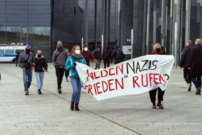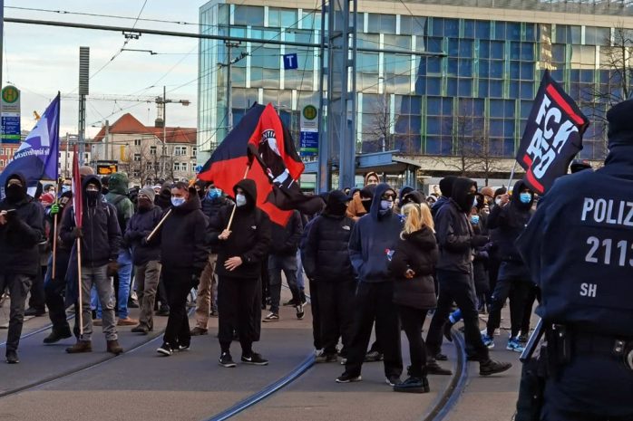 Aktuell bewegt sich in der Innenstadt nicht viel. Mindestens mehrere hundert Pandemie-Leugner/-innen stehen in der Großen Fleischergasse und kommen nicht weiter, weil Antifaschist/-innen am Richard-Wagner-Platz eine Blockade errichtet haben. Die Wartenden hören „Dieser Weg wird kein leichter sein“ von Xavier Naidoo – wie wahr – und rufen „Wir sind das Volk“ und „Merkel muss weg“.