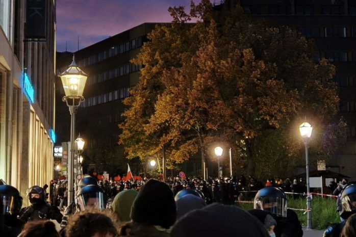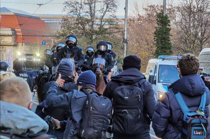 Mehrere hundert Pandemie-Leugner/-innen befinden sich in der Großen Fleischerkasse in einem Polizeikessel. An allen anderen Orten in der Innenstadt scheint es mittlerweile ziemlich ruhig geworden zu sein. In der Hainstraße kam es vor etwa einer halben Stunde zu einer Auseinandersetzung zwischen Gegendemonstrant/-innen und mutmaßlichen Neonazis. Ob es dabei Verletzte gab, konnten wir nicht feststellen.